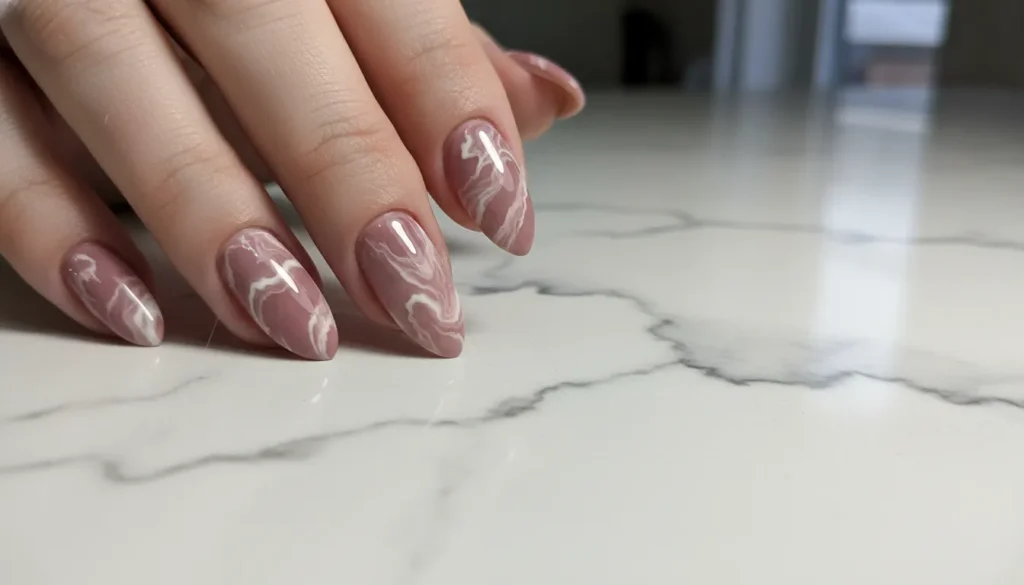 Marble nails look incredibly fancy but are surprisingly doable at home. Mix dusty rose with white and maybe a touch of gray for that realistic marble effect.