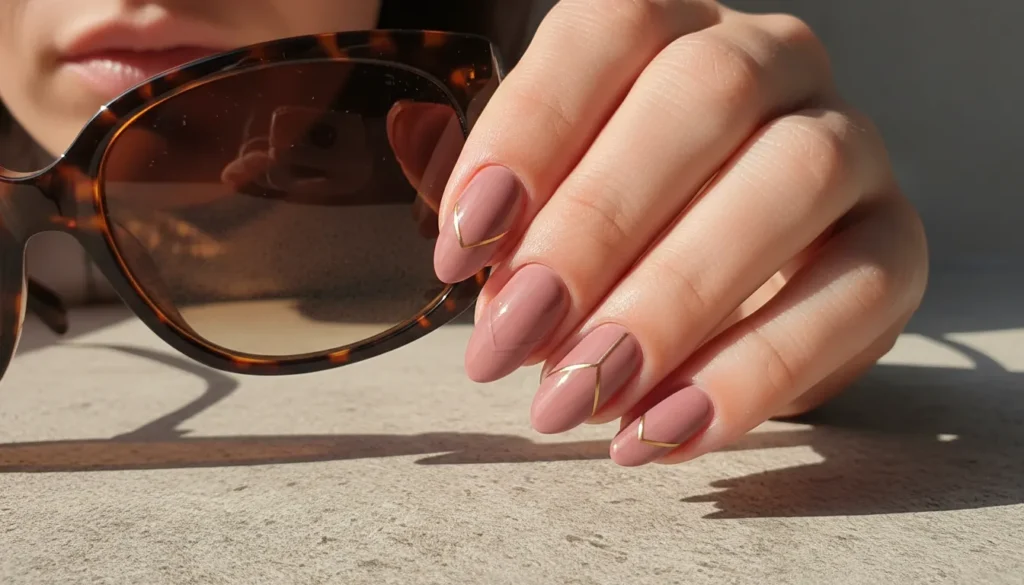 Thin metallic stripes—gold, silver, or rose gold—add structure and interest to dusty rose nail designs. You can do vertical stripes, horizontal stripes, or even create geometric patterns.