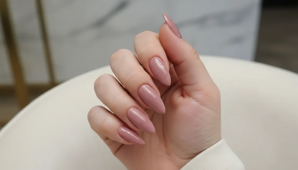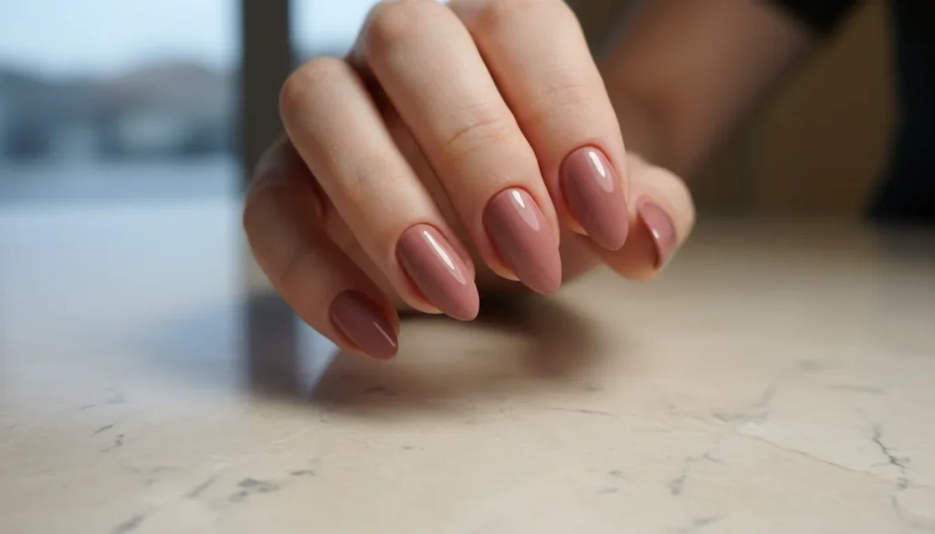 Let’s start simple because honestly, sometimes simple is best. A solid dusty rose on almond-shaped nails is what I reach for when I want to look polished but don’t have time for anything fancy.