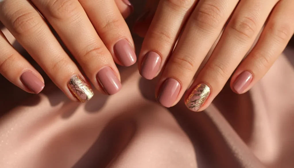 Okay, this is where things get fancy. Add some thin gold lines or small gold foil accents to your dusty rose manicure, and suddenly you’re walking around with jewelry on your fingertips.