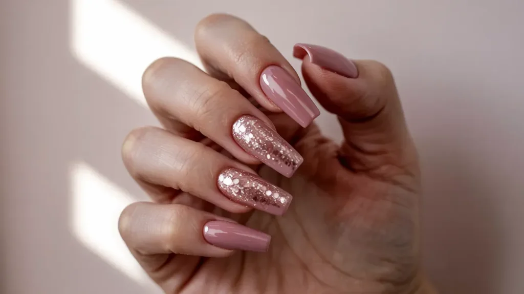 If you like a little drama (who doesn’t?), try dusty rose on coffin-shaped nails with glitter accents. The long coffin shape is bold on its own, and adding sparkle makes it even better.