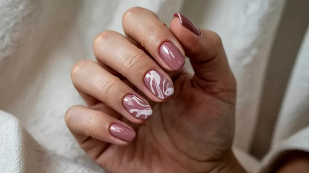 Abstract art on nails is having a major moment. White or cream swirls on dusty rose nails give you that modern, artistic vibe without looking too busy.