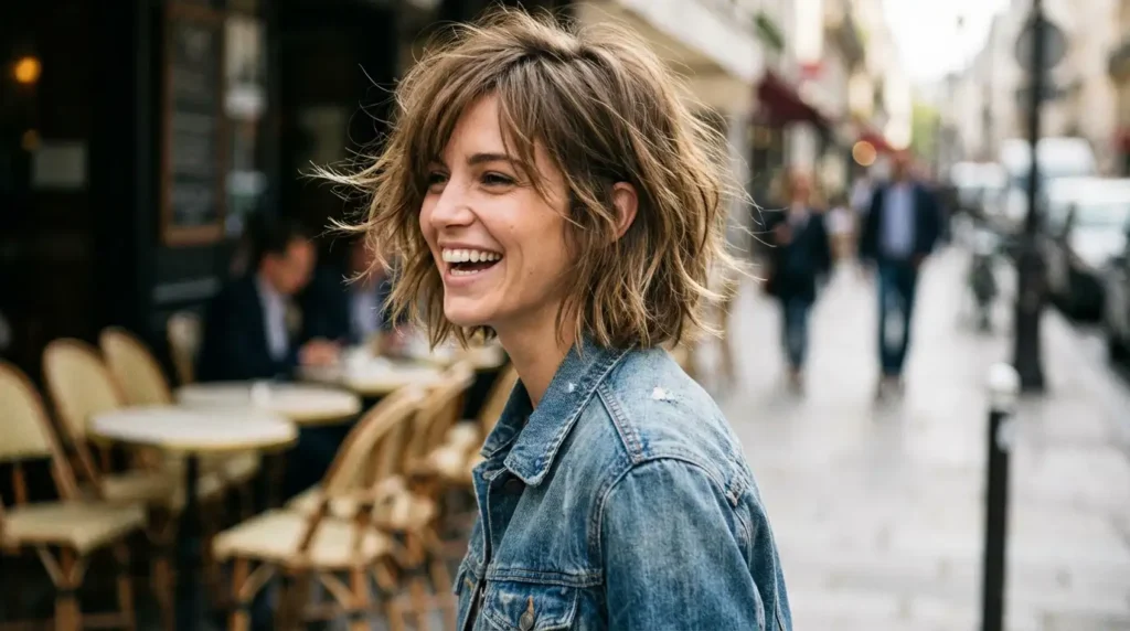 If you want to embrace texture rather than fight it, the razor-cut shaggy bob is your jam. This textured bob uses a razor instead of scissors to create soft, feathered layers throughout. It removes weight from thick hair while adding tons of movement and dimension. This ear length short bob looks amazing when you scrunch it with some mousse and let it air-dry—no fussy styling required. It’s got that rock-and-roll edge without being too high-maintenance.