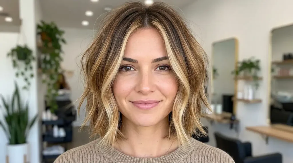 For a square face with a strong jawline, you want to soften those angles. A layered bob with soft, piecey texture works beautifully. Avoid super-blunt, one-length cuts that end right at your jaw—they’ll emphasize the squareness. Instead, add movement through layers and texture. Wavy or curly versions of the ear-length bob are particularly flattering because the soft curves balance your strong angles. Side-swept bangs or long curtain bangs also help soften your forehead.
