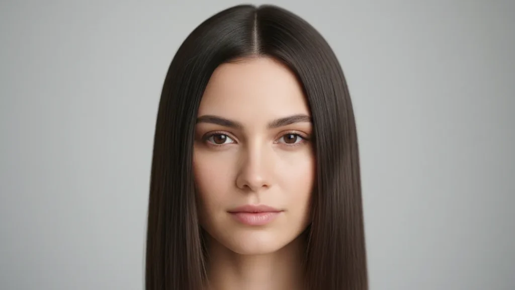 Sometimes the simplest styles hit hardest. Part your hair straight down the middle, blow-dry it smooth, and finish with a shine serum. That’s it.