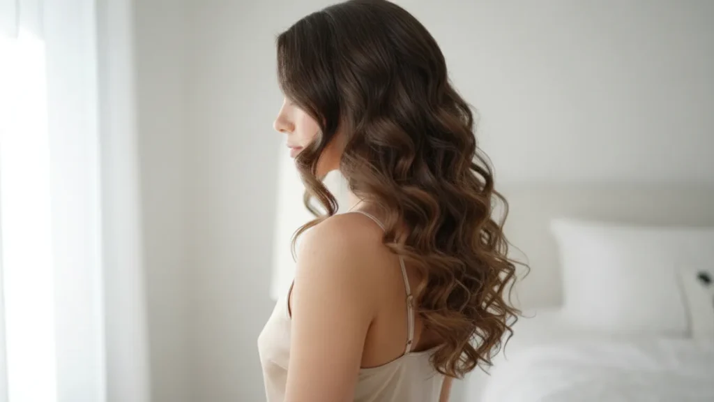 Now here’s where it gets interesting – Hollywood waves might look complicated, but they’re surprisingly doable at home. Use a large-barrel curling iron to create uniform waves, then brush them out gently with a paddle brush.