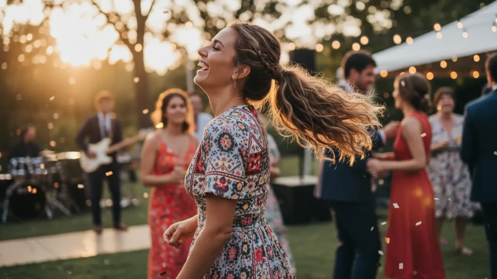 For outdoor weddings, you want wedding guest hairstyles that can handle wind, humidity, and potentially changing weather. Braided styles, low buns, and textured updos are your best bet. Avoid styles that require tons of hairspray to stay in place or super smooth styles that show every flyaway – you’re just setting yourself up for stress.