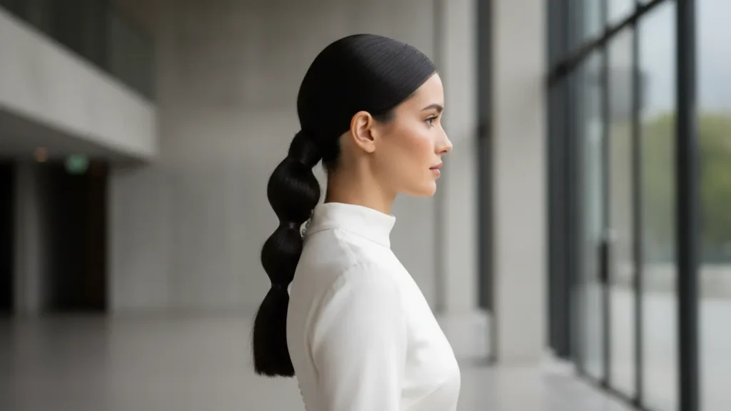 Pull your hair into a low ponytail, twist it around the base, and secure with bobby pins. Use a small amount of hair gel or pomade to smooth any flyaways. What makes this different from a regular bun is that polish – take an extra minute to really smooth everything down.
