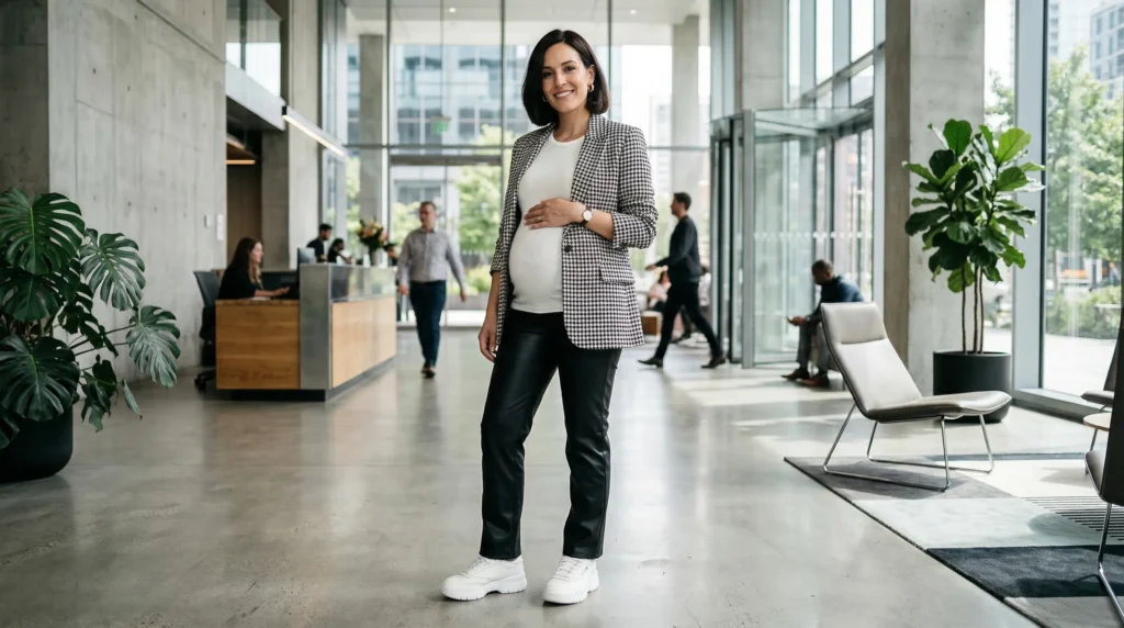 A fitted white top creates a smooth foundation. Faux-leather maternity trousers add texture and edge. The blazer brings balance when worn open, letting the silhouette breathe naturally. Sneakers keep it grounded and real.