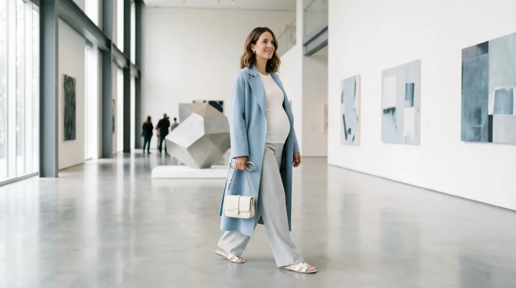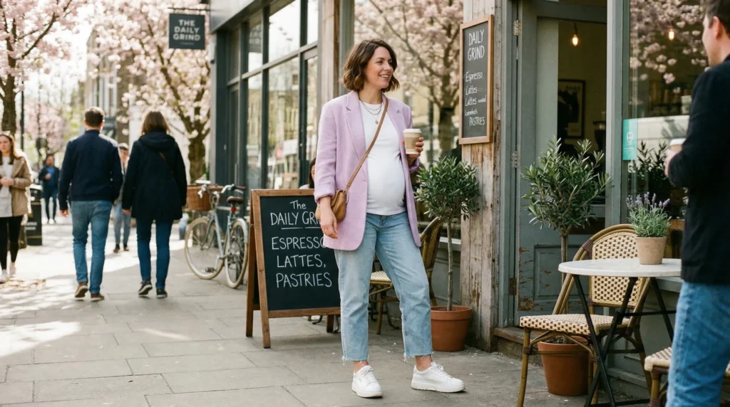 | Soft Tailoring | Pastel blazer, maternity jeans | Office, styled outings |