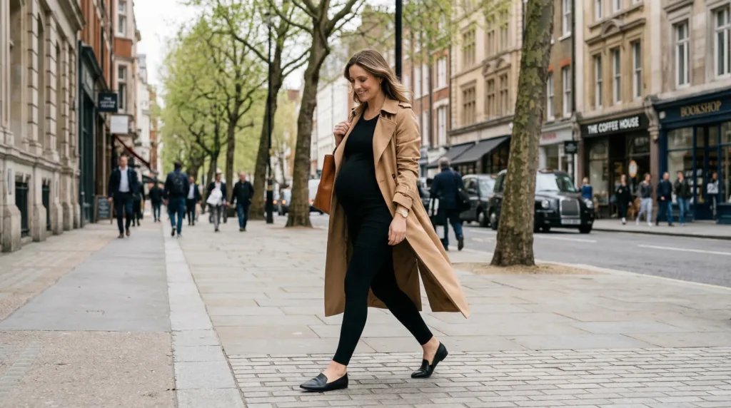 A long neutral coat is one of those investment pieces that carries you through pregnancy and beyond. Pair it with a stretchy black base layer, and you get a clean vertical line that feels both flattering and effortless. Flat loafers are the right call here. They’re polished enough for the street and kind to your feet on longer days.
