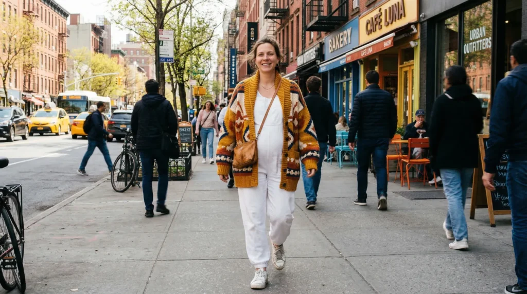 Some days call for comfort first, but that doesn’t mean style disappears. This look leans into color as a mood lifter, which feels especially right in spring 2026. An oversized knit cardigan with a bold pattern brings instant energy, while a clean white base underneath keeps everything grounded.