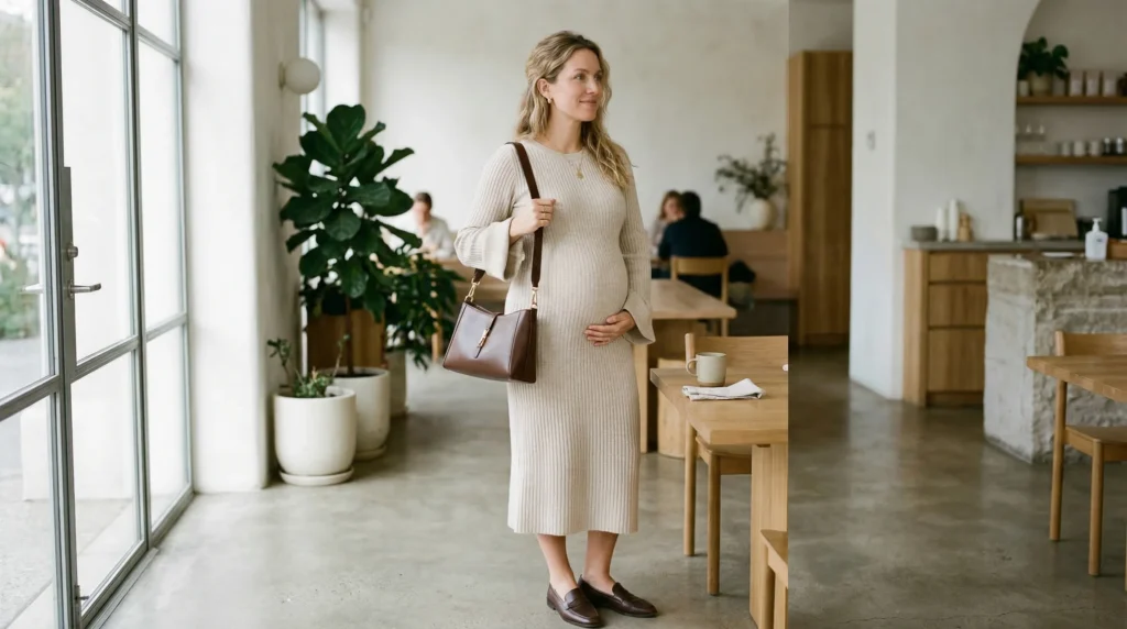In my experience, a ribbed knit dress is one of the smartest things a pregnant woman can own. It hugs the body without restricting it, and the subtle flare on the sleeves adds a touch of elegance. Pair it with a structured shoulder bag, and you have an outfit that moves seamlessly from a morning coffee to a casual afternoon meeting.