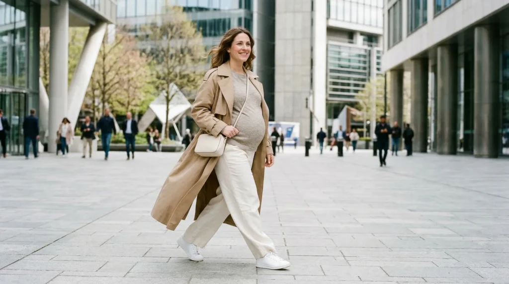 A lightweight knit top paired with relaxed trousers is a combination I always recommend for pregnant women’s spring fashion. It allows room for growth and keeps the silhouette clean. The coat ties everything together and makes the outfit feel complete. Sneakers here are a smart choice because they keep the look grounded and practical for city life.