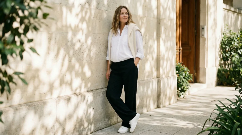 A crisp oversized shirt paired with fluid black trousers creates contrast without any effort. A draped knit over the shoulders adds warmth and visual interest. Minimal accessories keep the focus where it belongs. Sneakers make the whole thing current and comfortable.