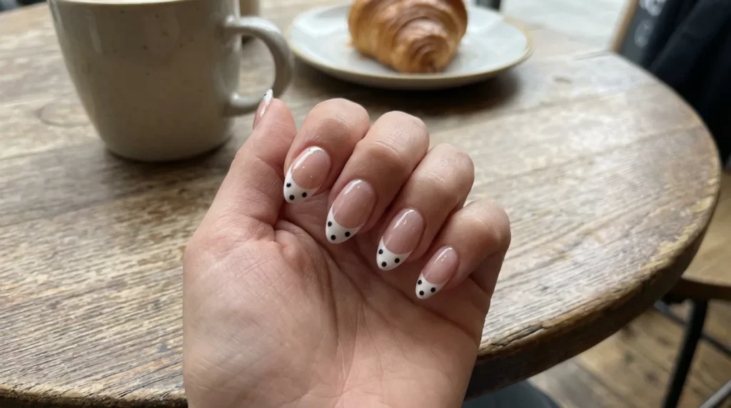 This design takes the classic french manicure and adds a fun, retro twist with black and white polka dots on the tips. What I love about this look is how it manages to feel cute without being childish—it’s sophisticated but still playful.