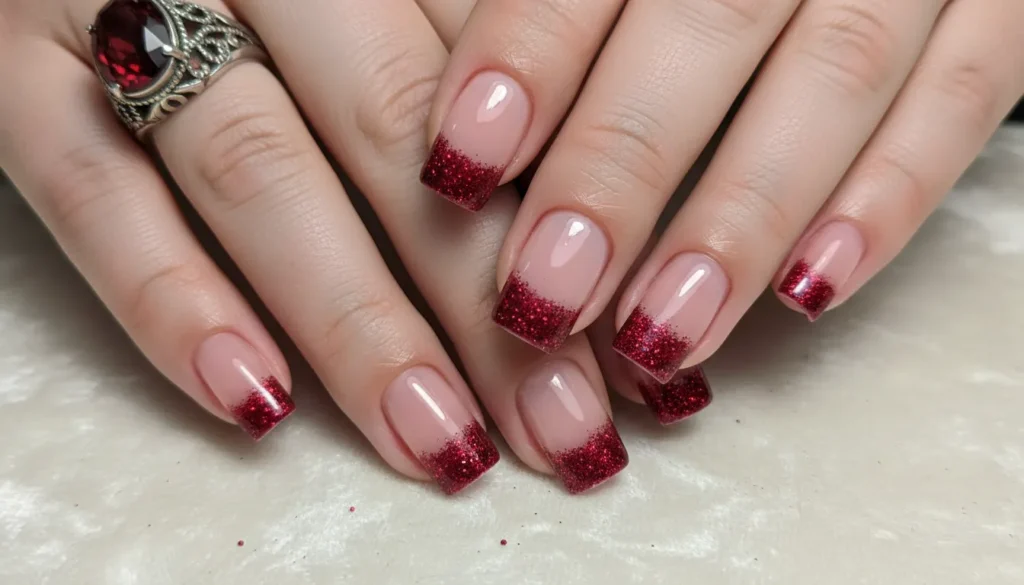 15. Ruby Red Glitter French Tips