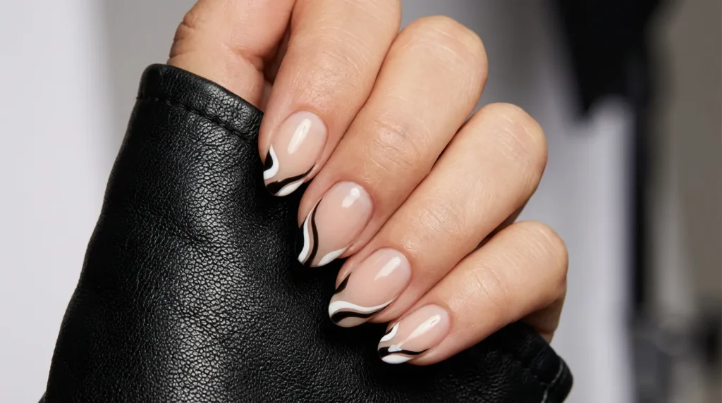 Black and white wavy lines replace the traditional tip in this modern, artistic design. The abstract swirls give off such a cool, contemporary vibe—like someone took a piece of modern art and put it on your nails.