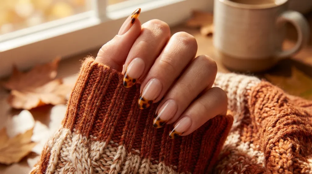 Warm amber and deep brown tortoiseshell patterns on your tips create such a rich, sophisticated look—especially for fall. This french tip design feels like a total upgrade from basic white while still being understated enough for professional settings.
