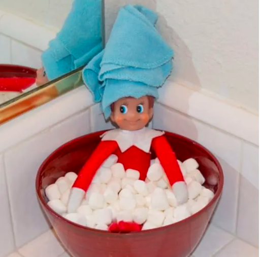This cozy marshmallow bath setup is a classic because it instantly makes your elf feel alive and full of personality. You can fill a bowl with mini marshmallows, wrap a tiny towel around the elf’s head, and leave a few “bath essentials” nearby like a pretend soap bottle or cotton-ball bubbles. Kids immediately imagine their elf winding down after a long night of mischief, and the scene makes mornings feel special without needing complicated props. Among all the Fun Elf on the Shelf Ideas, this one remains a favorite because it looks adorable and takes just a minute to create.