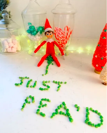This playful scene features your elf sitting beside peas arranged into a pun or short message. The simplicity of the materials makes the idea effortless, but the humor lands every single time. Kids love imagining their elf trying to spell something with vegetables, especially because it feels like a tiny mess only a mischievous elf would make. It also adds a cute moment of surprise at dinner or snack time.