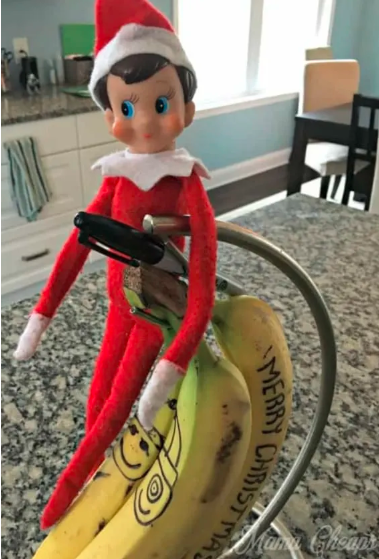 Using a banana peel as your elf’s “note paper” is one of the most creative Fun Elf on the Shelf Ideas because it uses something already in the kitchen. Your elf can “write” a holiday greeting, joke, or morning message on the banana. It’s unexpected, cheerful, and easy to spot first thing in the morning. Kids feel like the fruit itself suddenly turned magical.