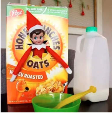 Hide the elf inside a cereal box so it pops out when breakfast is served. This idea is incredibly easy to set up but creates dramatic excitement in the morning. Kids feel like the elf has been waiting just for them to open the box.