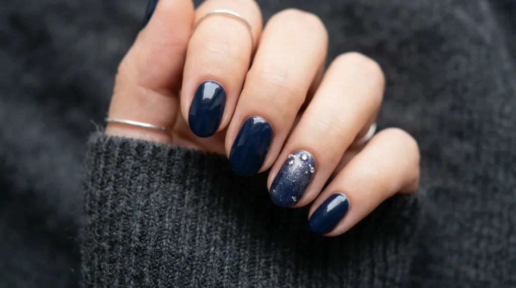 To recreate this, reach for OPI GelColor Russian Navy or CND Shellac After Dark. For the accent nail, sponge fine silver glitter toward the center and place micro rhinestones while the top coat is still tacky. Seal twice. Celebrity manicurist Tom Bachik always talks about thin layers for depth rather than thickness — this design is exactly that philosophy in practice.