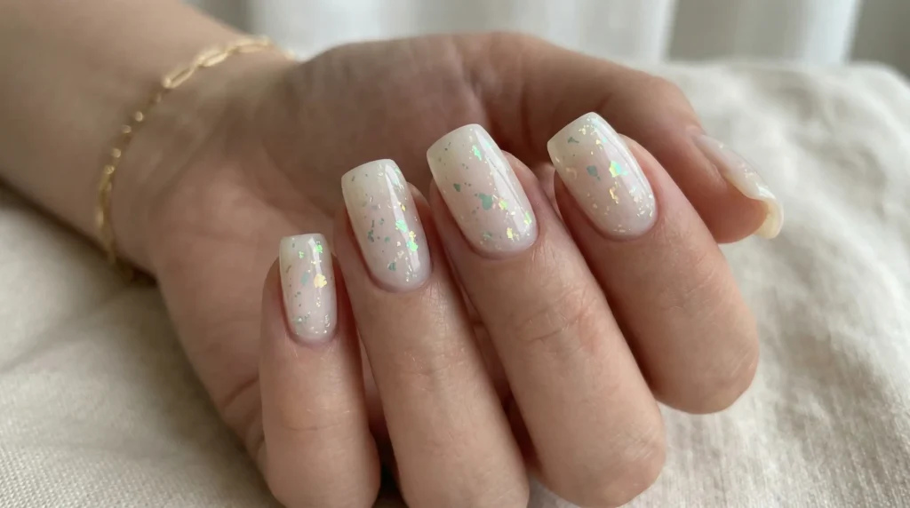 10. Milky Gel Nails with Iridescent Confetti Finish