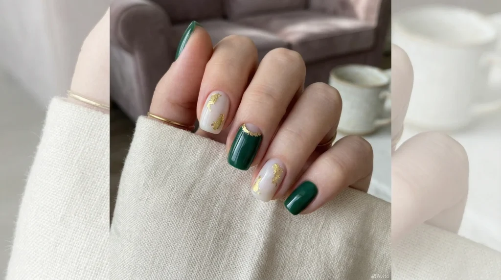This color pairing immediately reads quiet luxury. Deep emerald green next to milky white creates contrast without drama, and the gold leaf detail adds softness rather than shine. It’s refined, slow, and surprisingly wearable even if you don’t usually go near nail art.