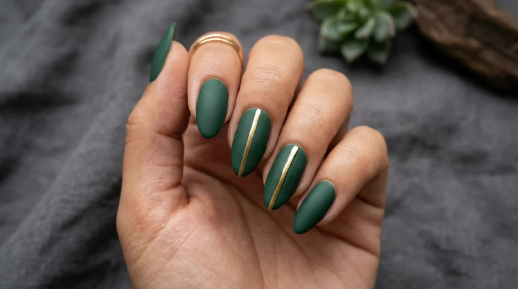 The one trick that editorial nail artists keep coming back to: apply the matte top coat before adding the gold line, then apply a thin glossy layer only over the stripe. The texture contrast between the matte green and the glossy gold is what makes this design work.