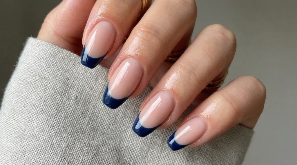 French manicures keep evolving, and this navy-tipped version feels especially strong for 2026. The nude base stays classic and flattering, while the deep blue tips add structure and confidence. It’s crisp, slightly graphic, and more versatile than you’d expect.