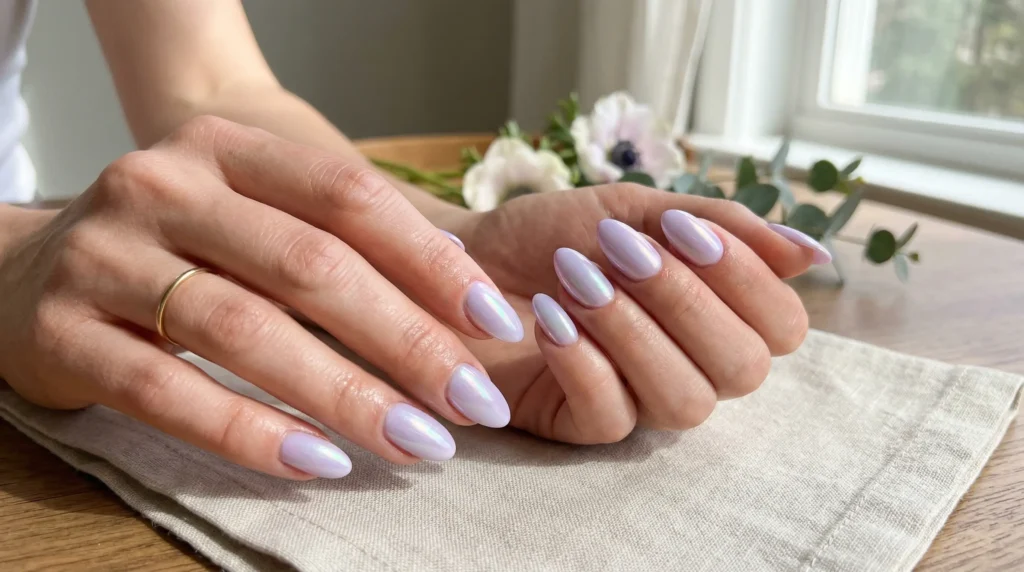 14. Lavender Gel Nails with Iridescent Chrome Effect