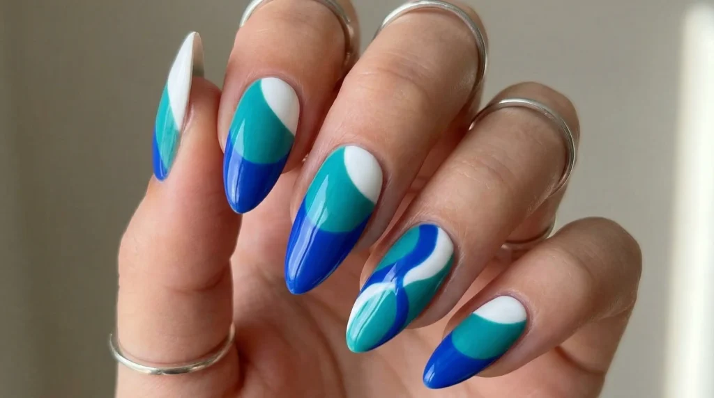 Use teal, cobalt, and crisp white gels applied with a fine brush for each section. Cure between every color layer — that’s what keeps the lines clean and prevents any bleeding between shades. If you’re nervous about freehand curves, a stencil works just as well.