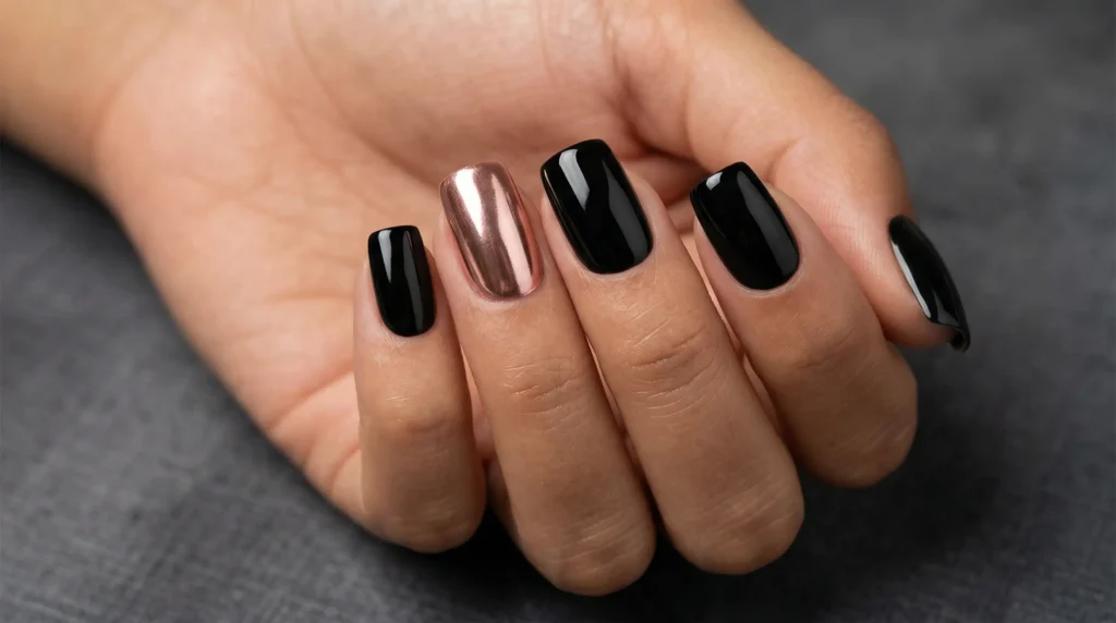 Use a true black gel like Madam Glam Perfect Black. The base has to be flawless, because black shows every flaw. File carefully, buff evenly, and apply ultra-thin coats. For the chrome, rose gold or champagne powder gives the warmest, most wearable contrast against black.