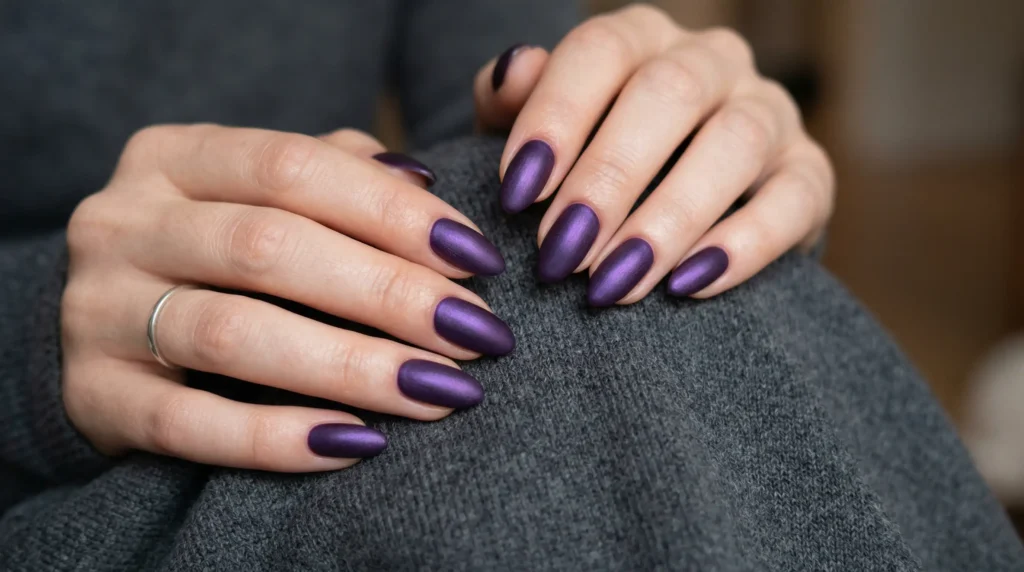 Start with a deep purple gel like Zoya Belinda, then layer a subtle metallic pigment on top. The finish depends entirely on blending. Too much pressure and it turns harsh. Too little and the effect disappears. A satin top coat instead of high gloss is the final step that changes everything — and it’s the one most people skip.