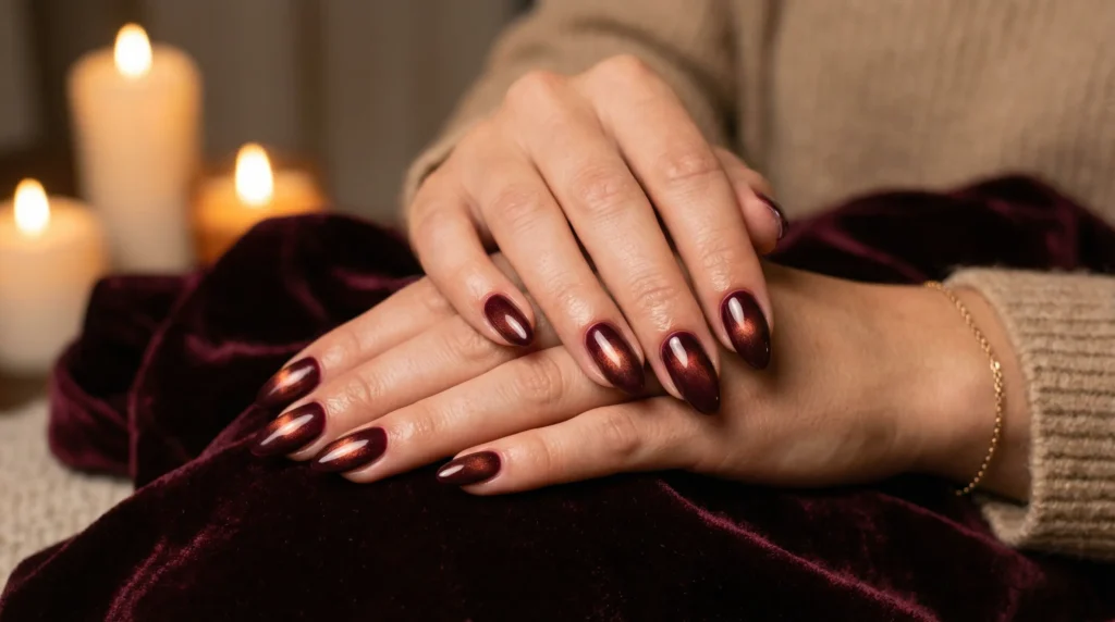To get this effect, start with a wine gel like CND Shellac Oxblood or OPI Malaga Wine, then layer a very fine bronze or copper magnetic pigment underneath the top coat. The glow should look embedded in the color, not sitting on top of it. Thin layers are crucial.