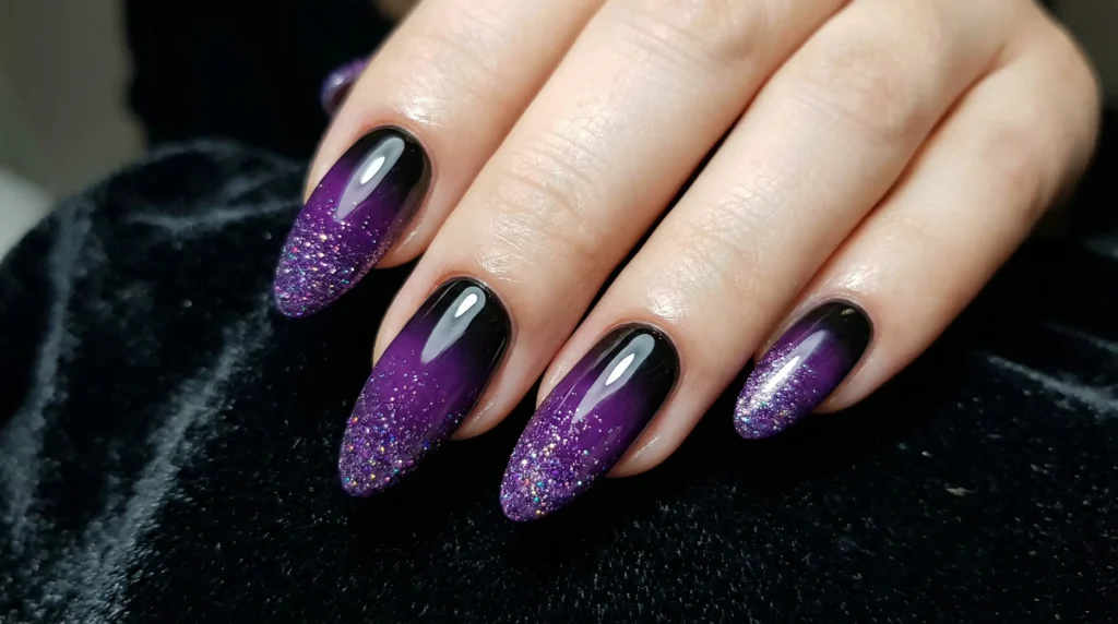 Use a deep black gel as the base, then blend a purple jelly gel upward from the tip using a sponge or brush. The glitter should be ultra-fine and layered sparingly — sealed under a glossy top coat to keep everything smooth. This look is entirely about the blending technique, not the decoration.