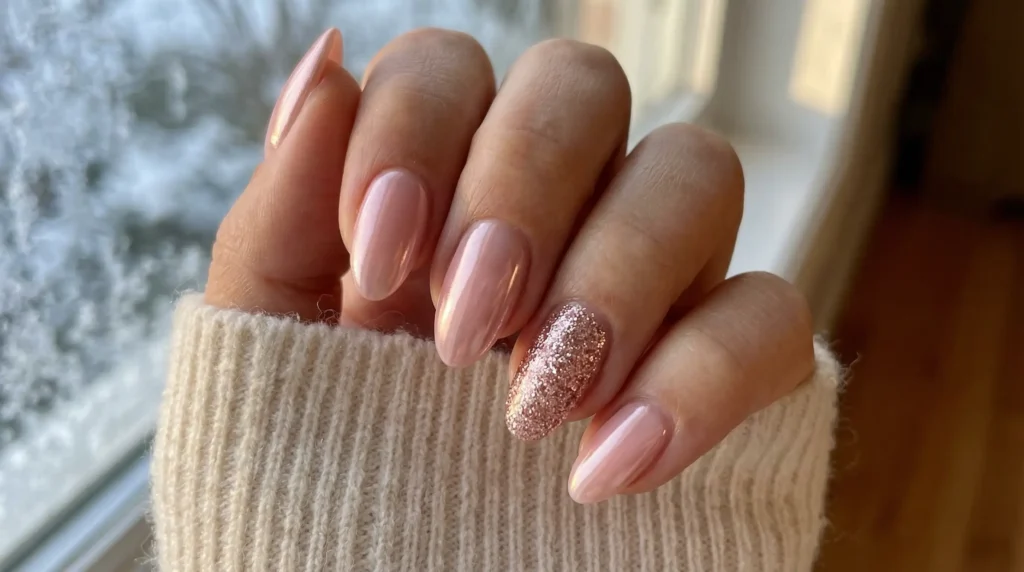 Go for a sheer blush base like OPI Bubble Bath or BIAB Teddy, then layer chrome powder on top. The glitter accent nail should use fine, dense particles — not chunky — so it melts into the design rather than sitting above it.