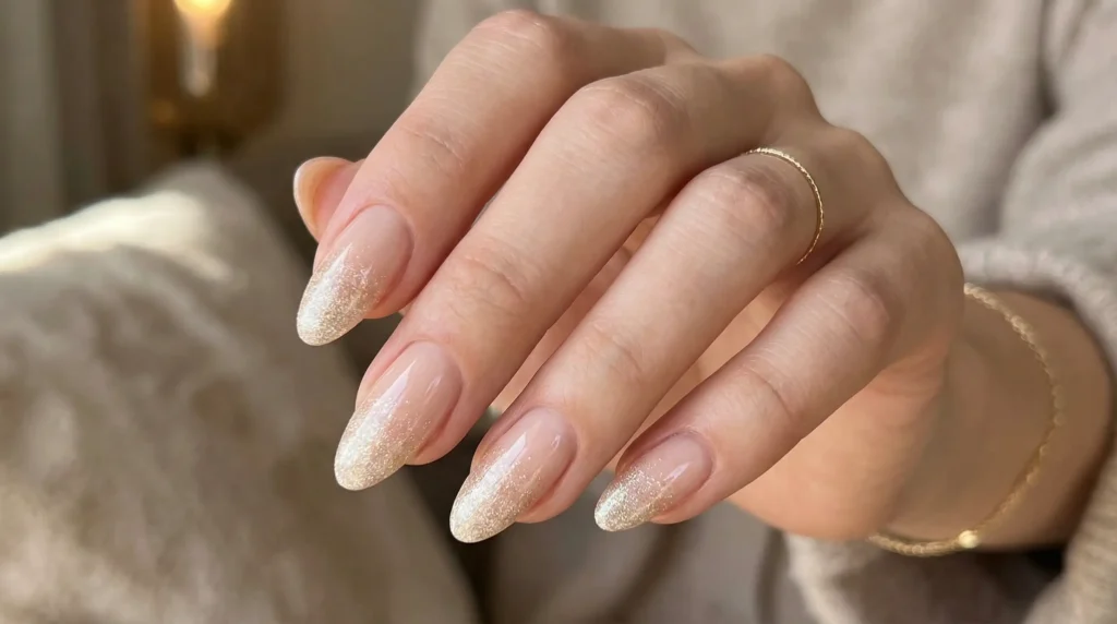 Start with a sheer nude gel and blend a champagne-toned glitter toward the tips using a soft brush or sponge. The shimmer should be ultra-fine, almost powdery, to avoid any surface texture. A high-gloss top coat pulls everything together and gives it that expensive-looking finish.