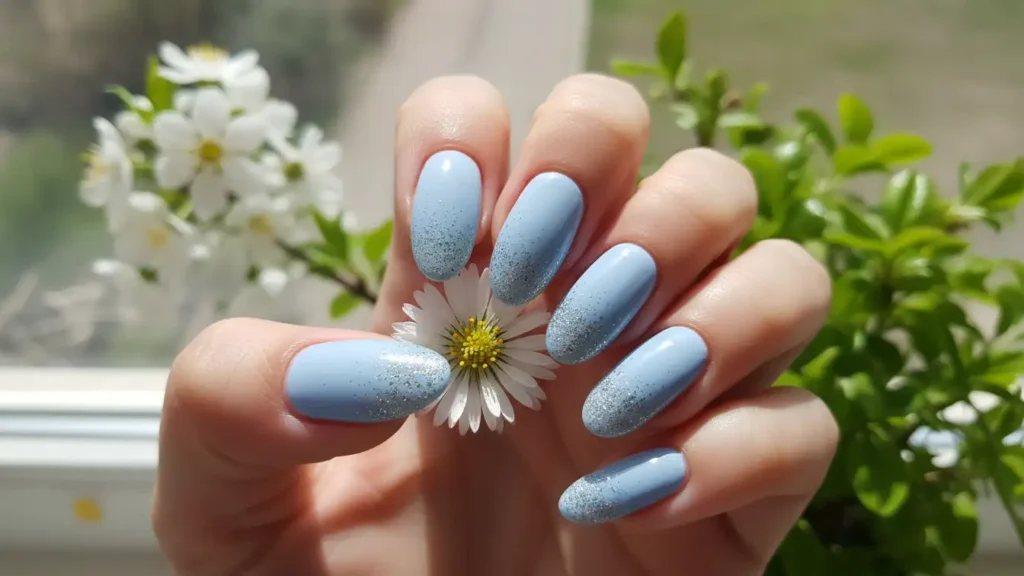 Pastel lovers, this one’s for you! A dreamy baby blue base with silver glitter creates that ethereal, cotton-candy effect. It’s absolutely perfect for spring and summer, and looks especially amazing with almond-shaped nails.
