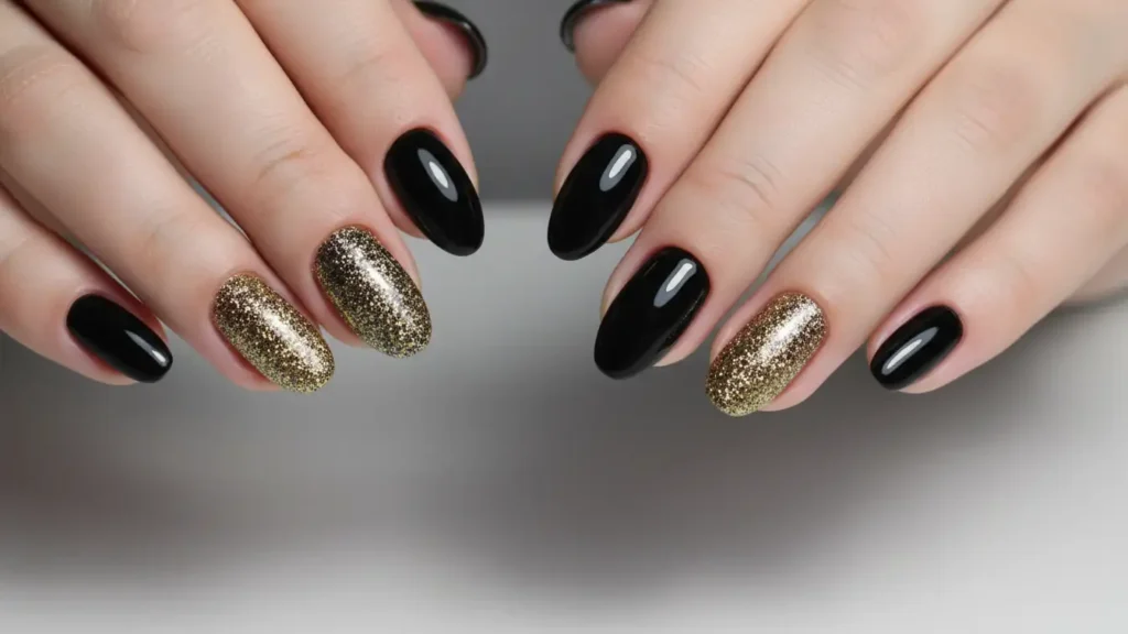 Want to make an entrance? Black ombre nails with gold glitter are dripping in drama and luxury. The dark-to-light gradient gives off serious high-fashion vibes. I wore these to a holiday party last year and got compliments all night long.