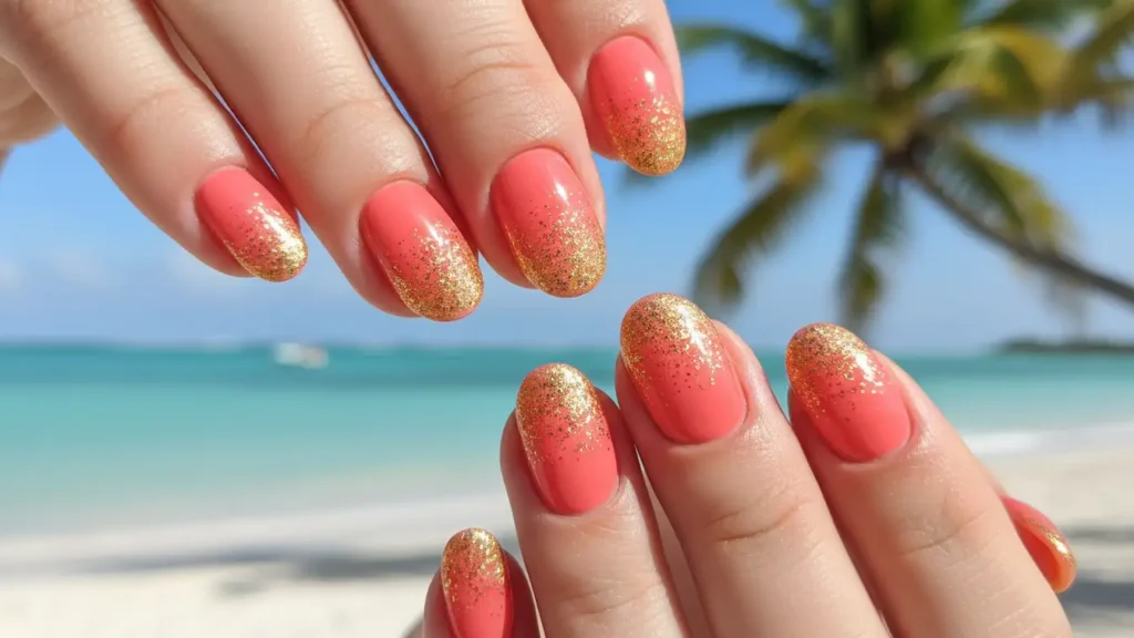 Bring on the tropical vibes! Coral fading into gold glitter is fresh, summery, and screams vacation mode. This color combo looks absolutely stunning with a tan and is perfect for beach trips or warm-weather events.