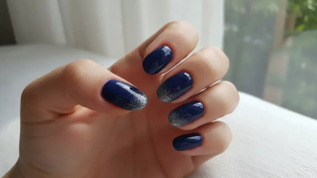 Navy is like black’s more interesting cousin. When you fade it into silver glitter, you get this mysterious, sophisticated look that feels modern and edgy. It’s a great alternative if you want something dark but not as intense as black.
