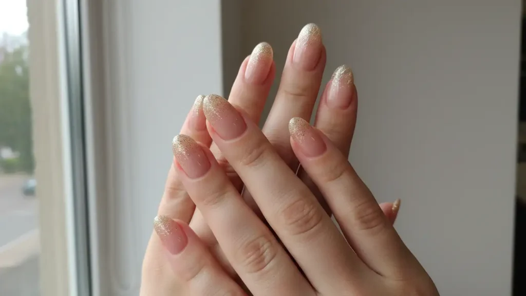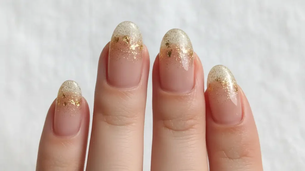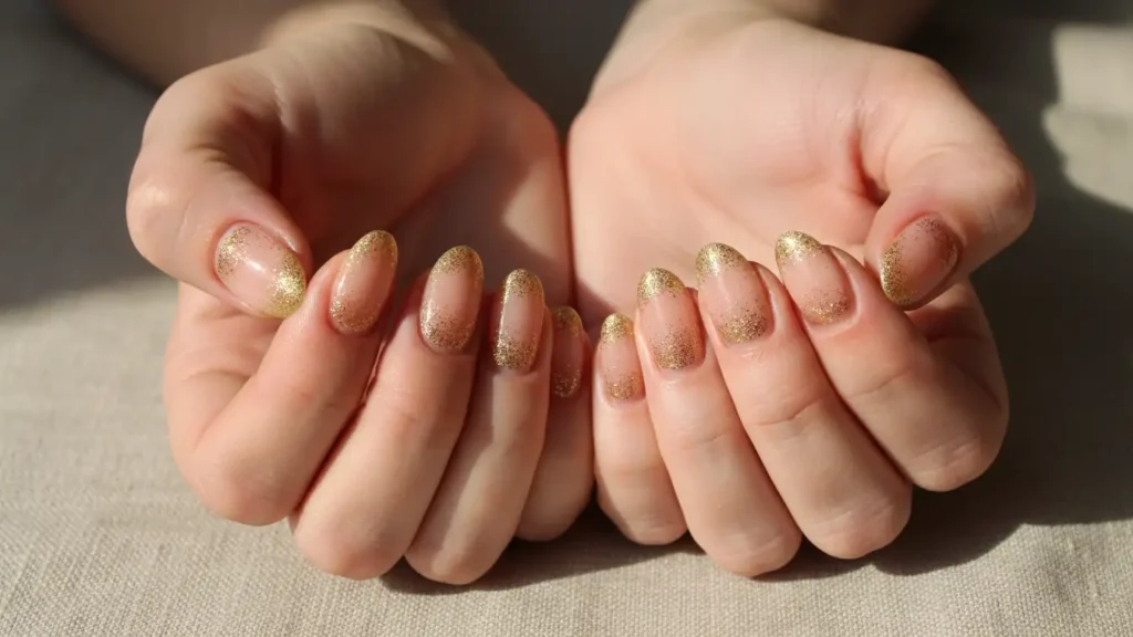 This is my personal favorite for everyday wear. A soft nude base gradually blends into champagne or gold glitter at the tips. It’s classy without being boring, and it literally goes with everything in your closet. Perfect for work environments where you want to look polished but not over-the-top.