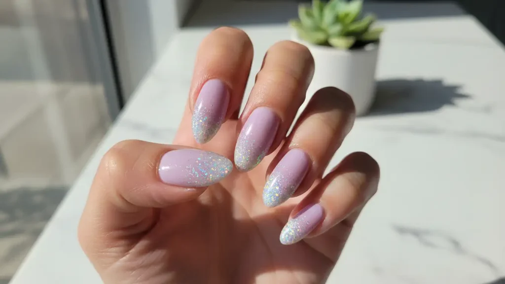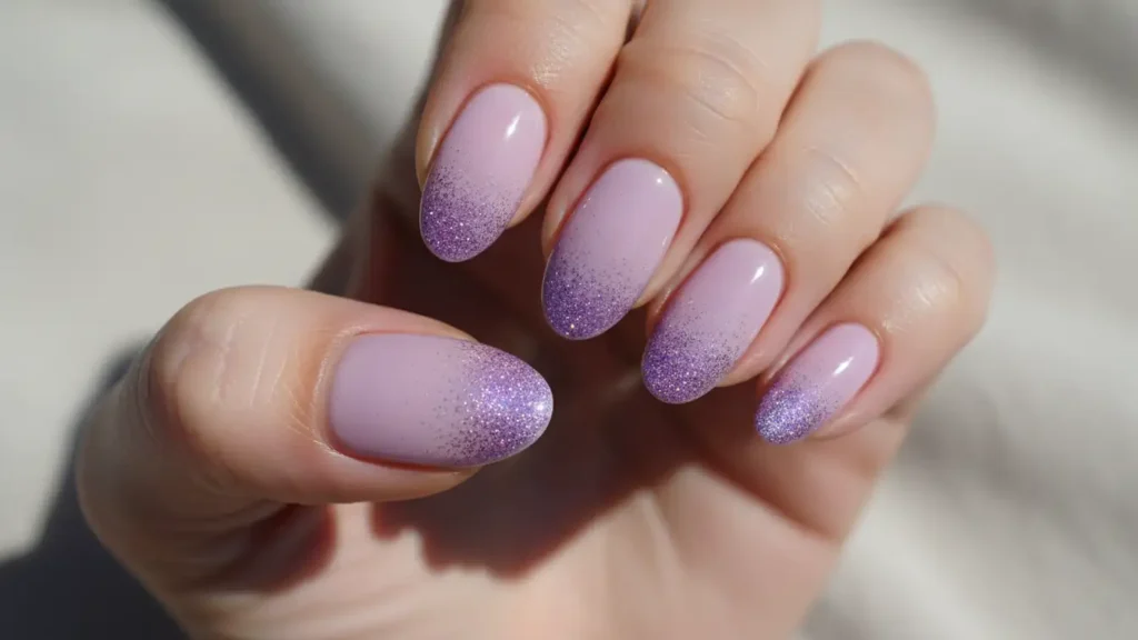 Starting with concentrated purple glitter at the base and fading into soft lavender creates this gorgeous reverse ombre effect. It’s unique, eye-catching, and perfect for anyone who loves purple.