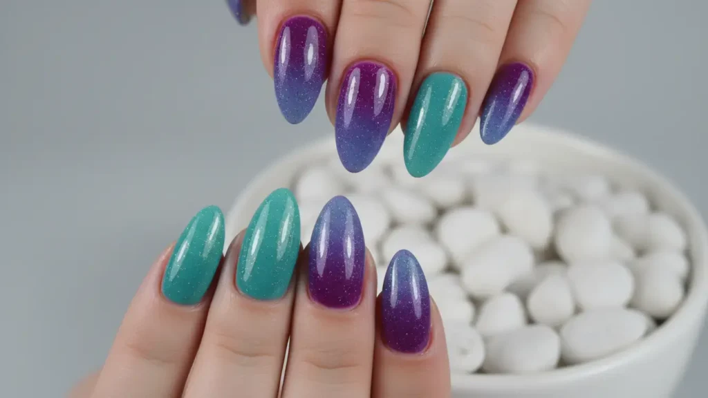 Bold, vibrant, and absolutely striking. Combining deep teal with purple and topping it with green glitter creates a look that’s daring and sure to turn heads wherever you go.