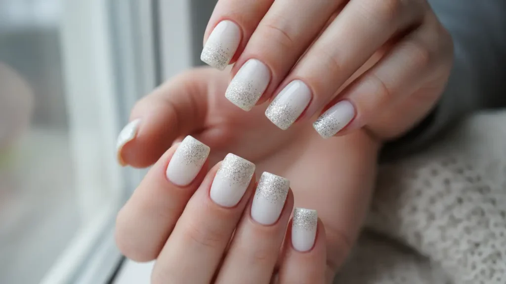 Winter wonderland vibes, anyone? This icy combination features a crisp white base melting into silver glitter. It’s perfect for holiday parties or any time you want to channel snow queen energy. Pair it with silver jewelry for extra impact.