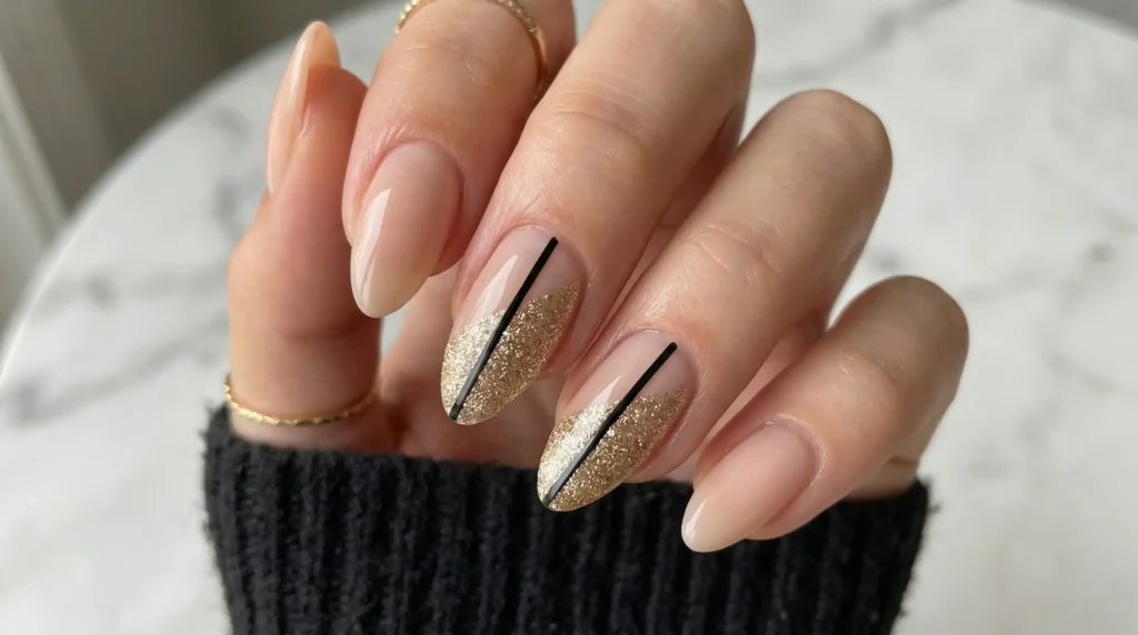 Similar energy to the last one, but more architectural. A nude base with a diagonal gold glitter section cutting across the nail, finished with a single black line at the edge.