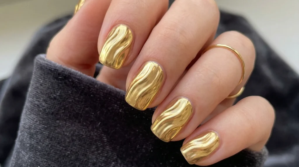 Short to medium nails with subtle wave-like texture built into the surface using sculpting gel, then coated in gold chrome powder. The chrome catches the texture, creating a dimensional, almost liquid effect.